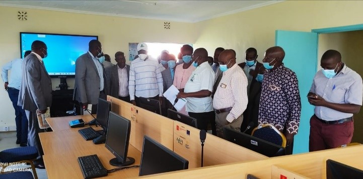 The Governor Migori County H.E. Okoth Obado (in white shirt and white cap) in the computer lab, among other guest during the commissioning.